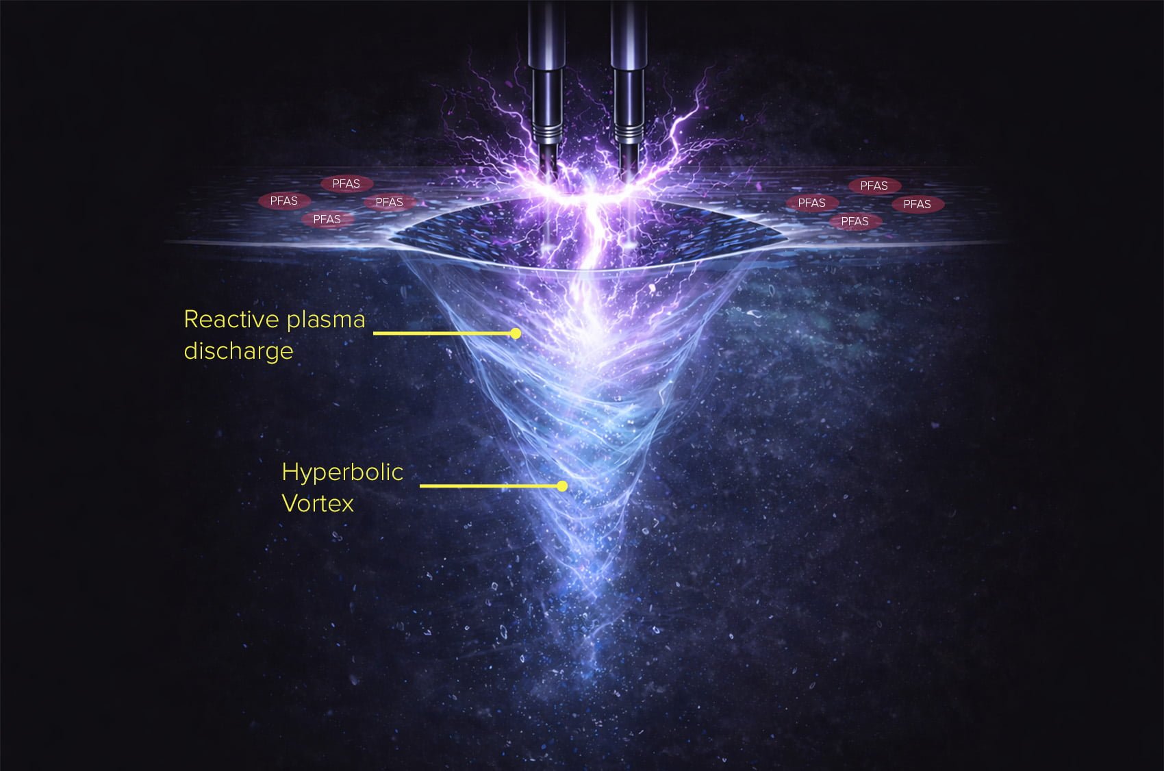 PFASDestructor applies a controlled plasma discharge directly to this interface using a high-velocity vortex flow.